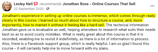 "Jonathan patiently guided me step by step, helping me with marketing and building the modules. He explained what I have to do at each stage of the process making it so easy. I then launched my online course and sold it and have also gained the confidence to do it again"